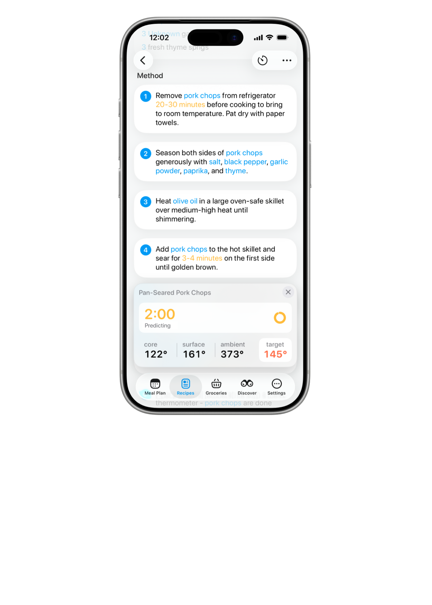 - Live temps right in the recipe itself