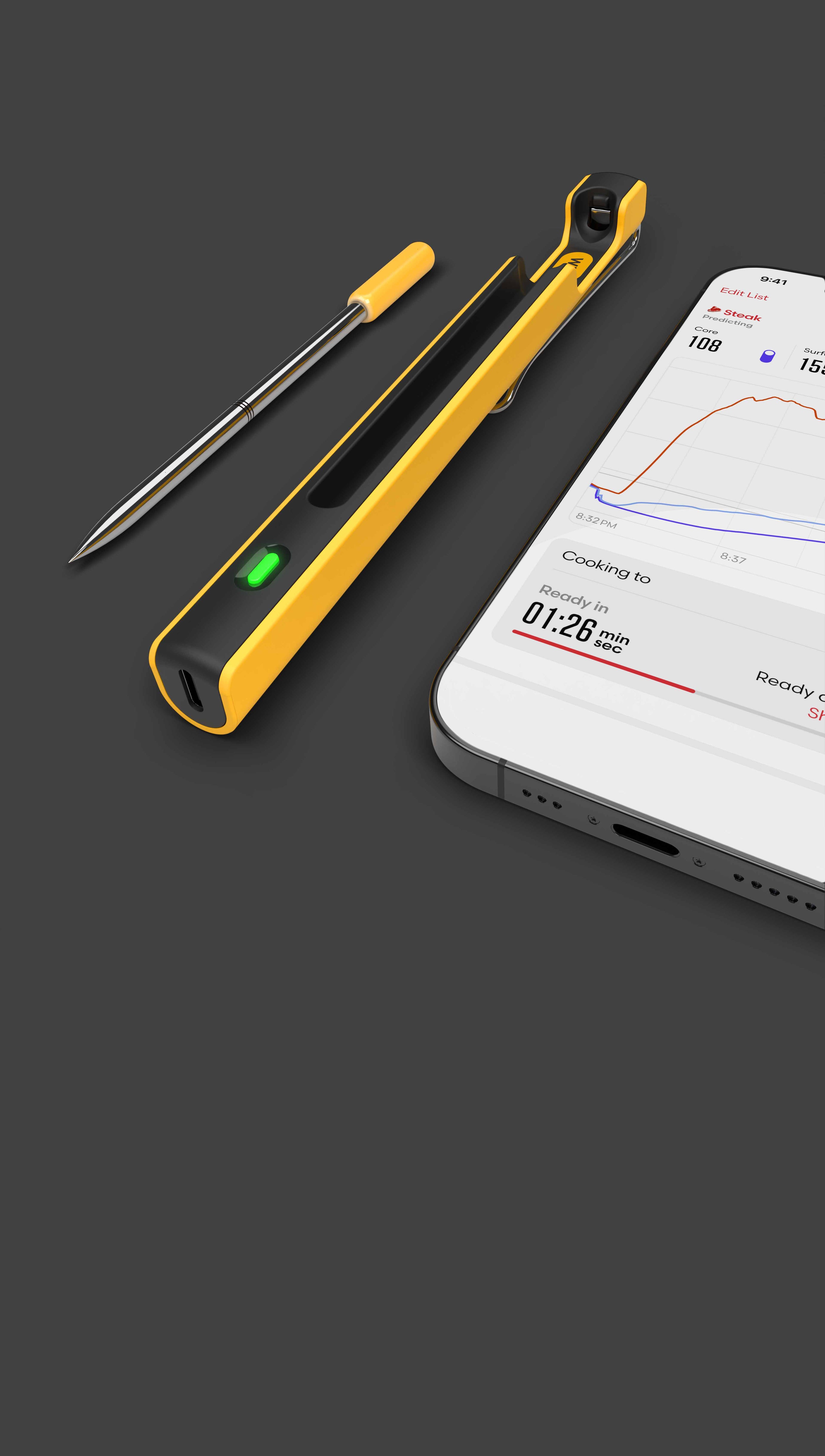 The Predictive Thermometer stays in your food throughout cooking, tracking both time and temp. It continuously calculates bacterial destruction until your food reaches official safety standards—usually at a more delicious doneness.