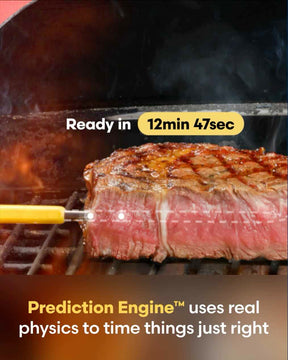 The Predictive Thermometer stays in your food throughout cooking, tracking both time and temp. It continuously calculates bacterial destruction until your food reaches official safety standards—usually at a more delicious doneness.