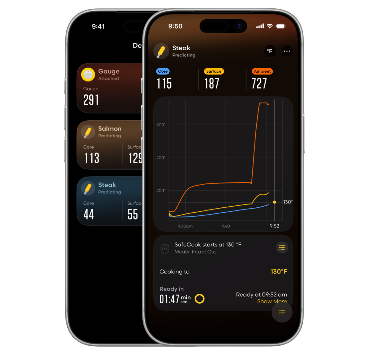 Control the Predictive Thermometer and other Combustion tools. Set target temp and select SafeCook™ settings. See key temperatures throughout your food and get an exact countdown to the time your food will hit that target temp.